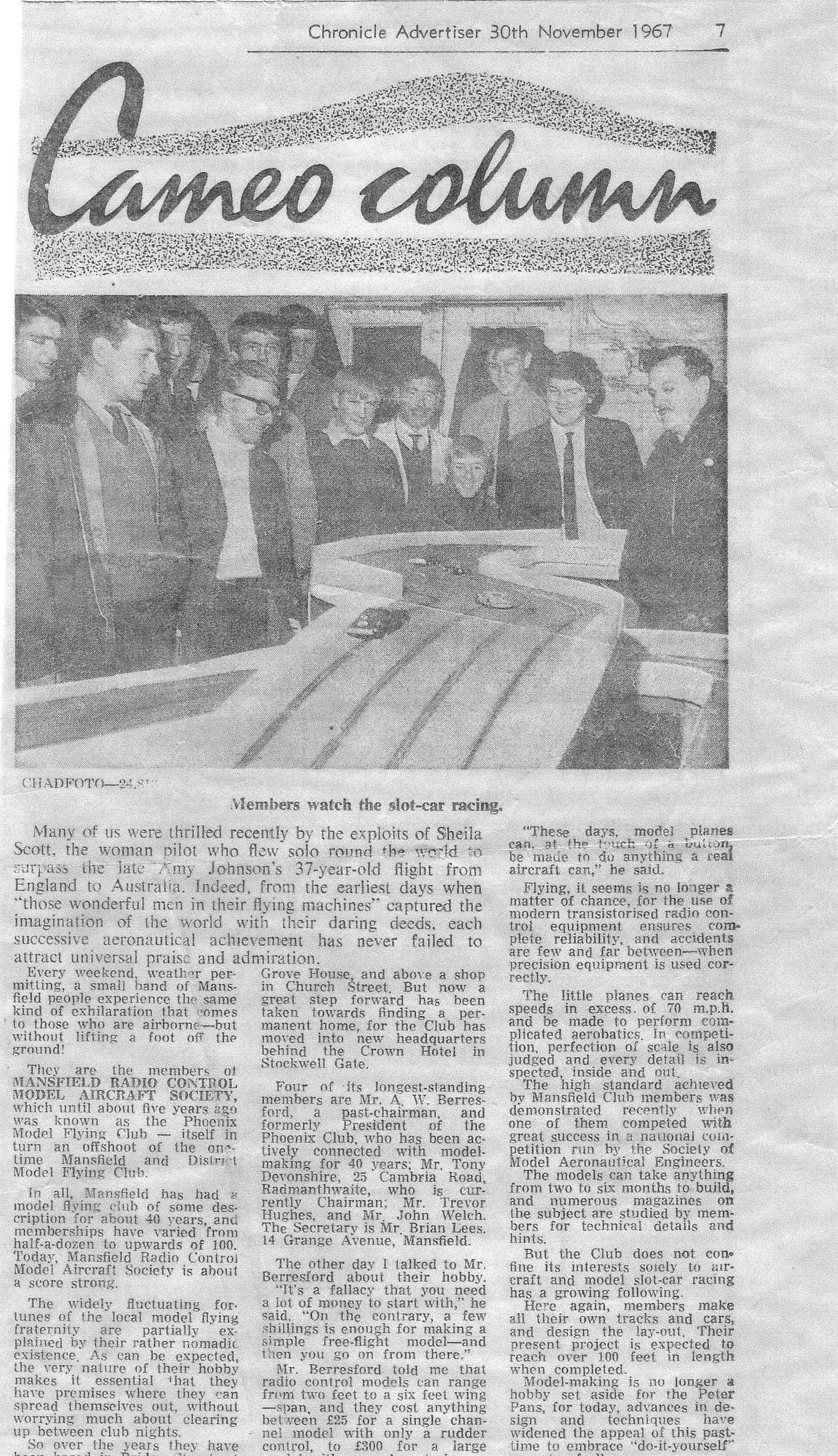 In the early days around 1956, the club flew only control line combat. We flew on Berry Hill Park and at this time, Mansfield had a strong control line combat team. We joined the MAMAC League which included clubs from Birmingham, Nottingham and Derby, Newark, Huddersfield and Sutton in Ashfield plus some others I can’t remember. The clubs flew in comps against each other both away and at home. The Mansfield team won the league three years in succession so retaining the cup for good.